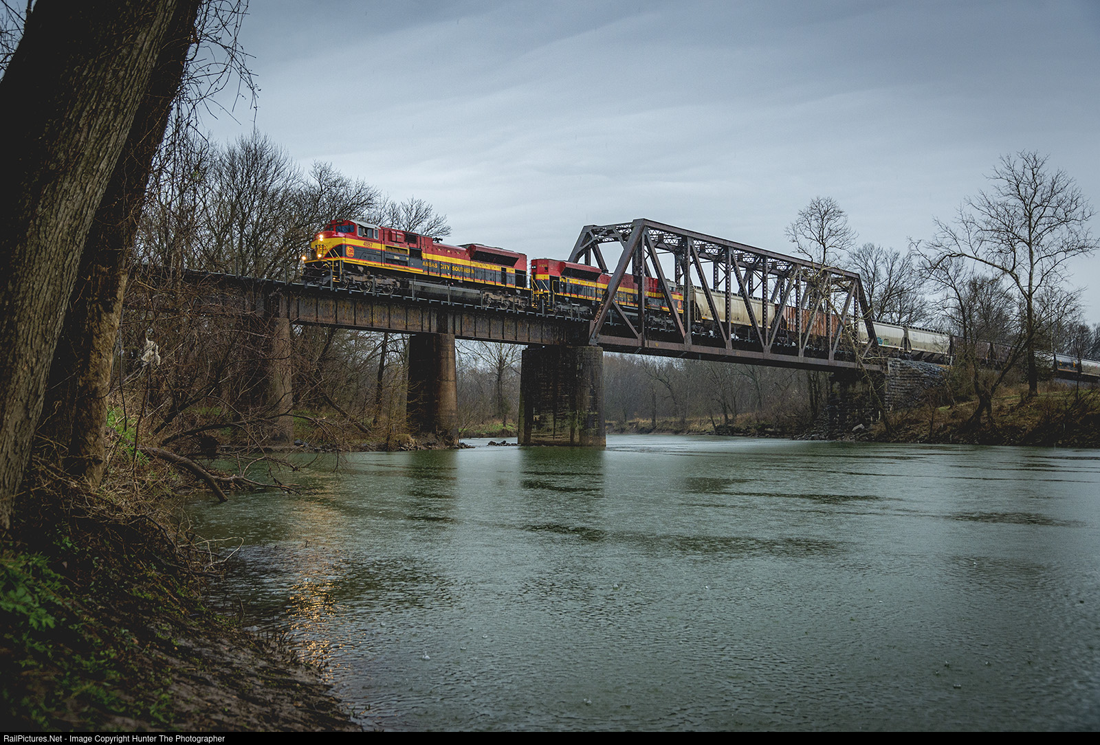 A Kansas City Southern grain train, led by a pair of SD70ACe locomotives, head north across the Illinois River near Watts, OK on a rainy March 21, 2022 afternoon.