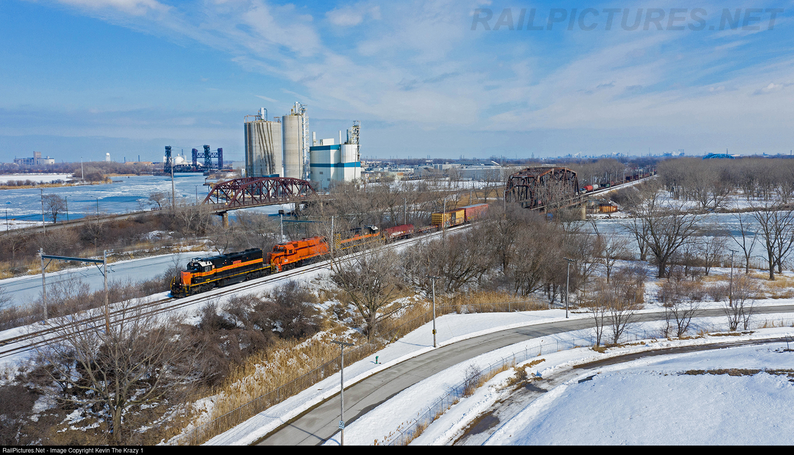 A westbound South Shore Freight crosses the Calumet River as it heads west to interchange with the BRC.