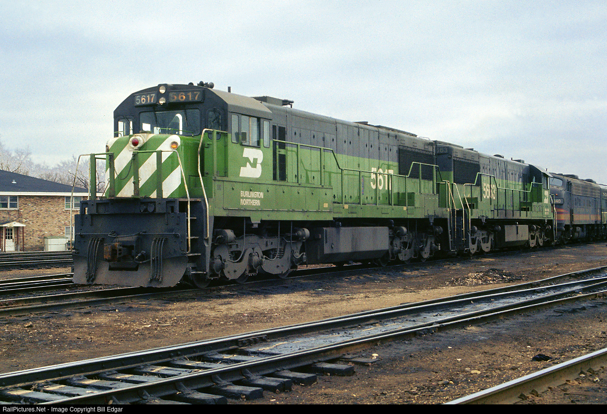 BN 5617 and 5663 pair up with some X-NP F9s at BN's former GN Harrison St. engine facilities in March 1974. BN 5617 was NP 2517, built in June 1965 and retired in March 1981. BN 5663 was CB&Q 575, built in April 1966 and retired in June 1981. The early U28Cs on NP and CB&Q were delivered in U25C carbodies, but had split front windshields rather than the picture window seen on BN 5617.
