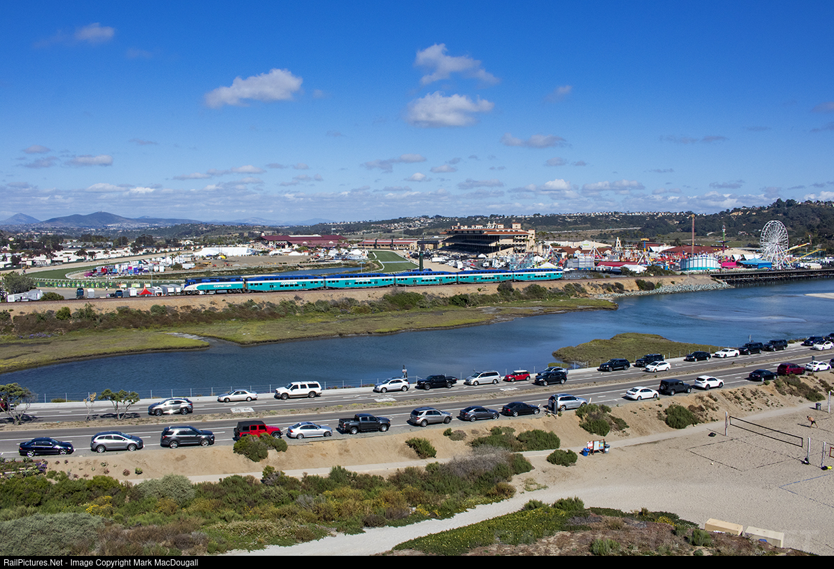 A Coaster train passes the San Diego Fairgrounds at Del Mar bound for Oceanside.