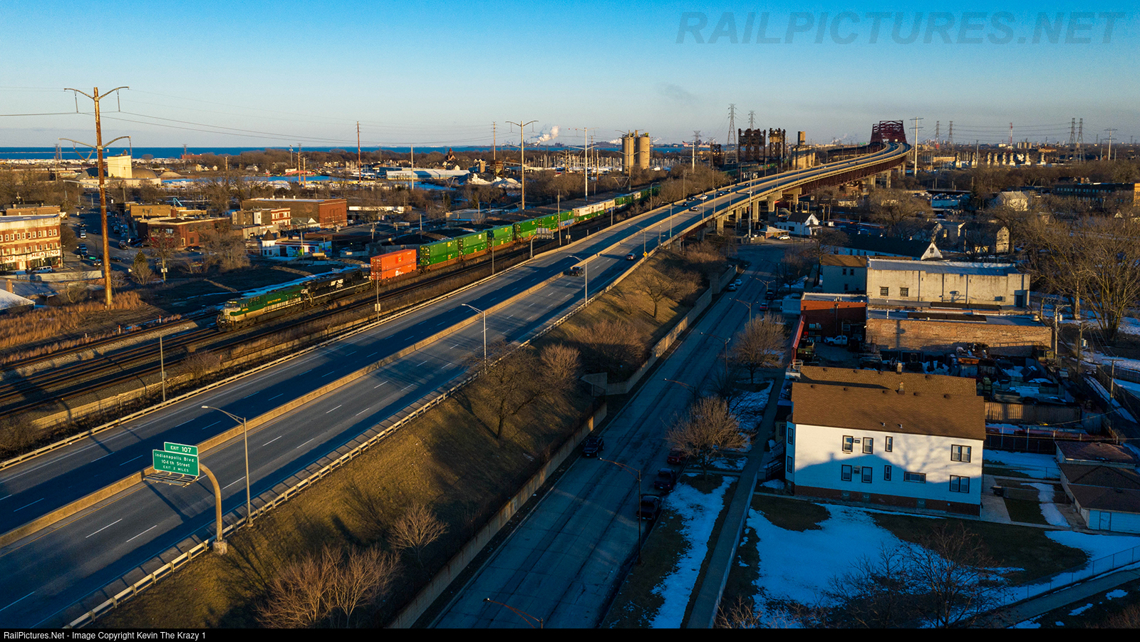 NS 23M with the Southern heritage engine makes its way along the Chicago Skyway at 93rd Street.