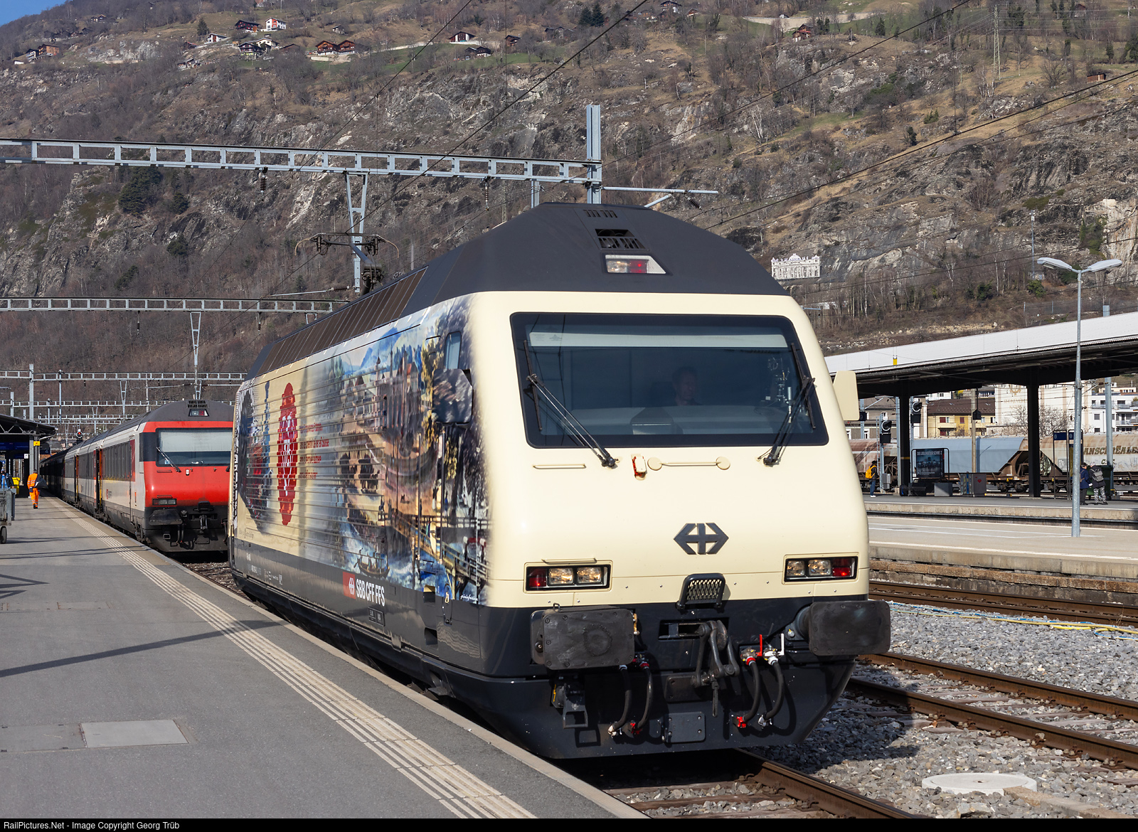 For celebrating 175 years railway in Switzerland (1847 to 2022), two locomotives with a special paint scheme (adhesives) were presented 10 days ago. The Re 460 # 019 has a picture of an "ICN" (Intercity Neigezug) tiliting train, leaving the 57 kilometer long Gotthard Base Tunnel (GBT), on one side. On this side, there is a picture of the first steamtrain, the "Spanisch Brötli Bahn" between Zürich and Baden and an old painting of the Zürich main station in the early years. The design was made by the austrian artist Gudrun Geiblinger. The locomotive arrived in Brig in front of the IR 1709 of the line IR 90 from Geneva Airport via Lausanne-Sion to Brig, a push pull train with standard cars type IV.