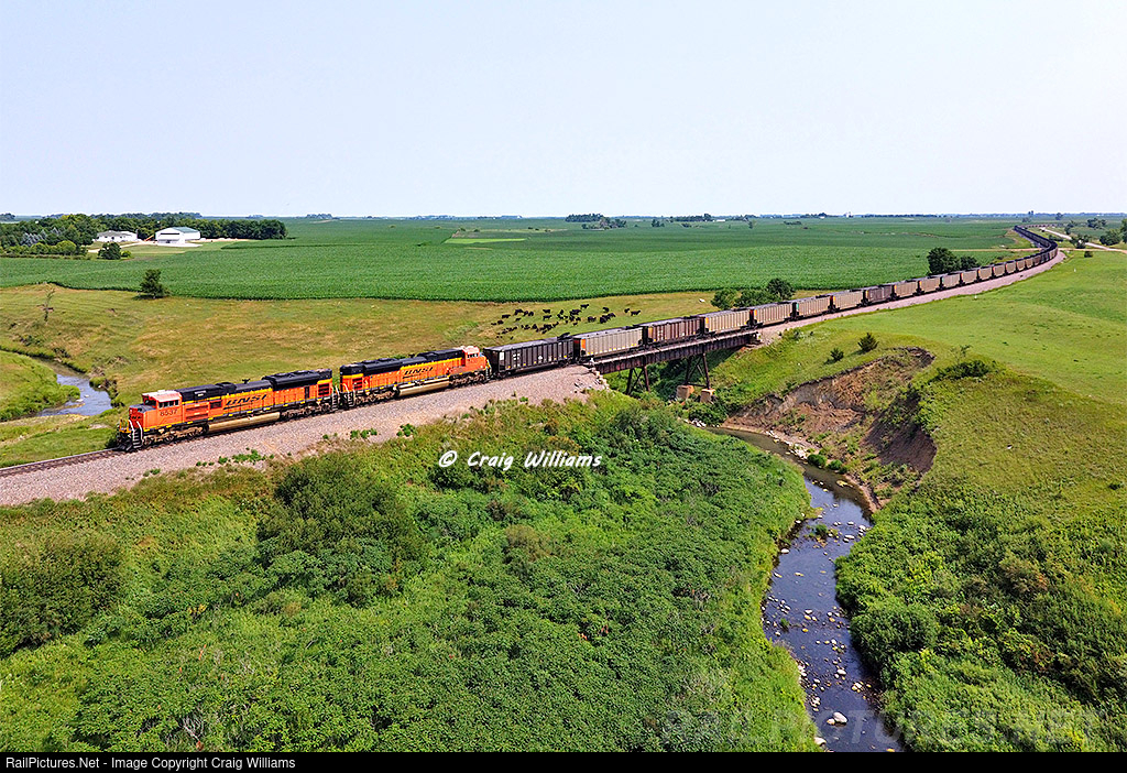 An Alma, WI, to Black Thunder Mine, WY, coal empty rolls south on the Marshall Sub. The train is working towards the next crew change point at Sioux City, IA. The train crosses the Redwood River couple miles north of Florence along highway 23. Even though empty, this train is about half way up the 30 mile climb from Marshall to a summit south of Ruthton. This is the Marshall Sub, a BNSF secondary mainline that twist and turn from Willmar, MN, to Sioux City, IA, with alot of the mainline tracking in and out along the Minnesota-South Dakota Stateline. Wildfires smoke was doing a great job of creating soupy skies all weekend!