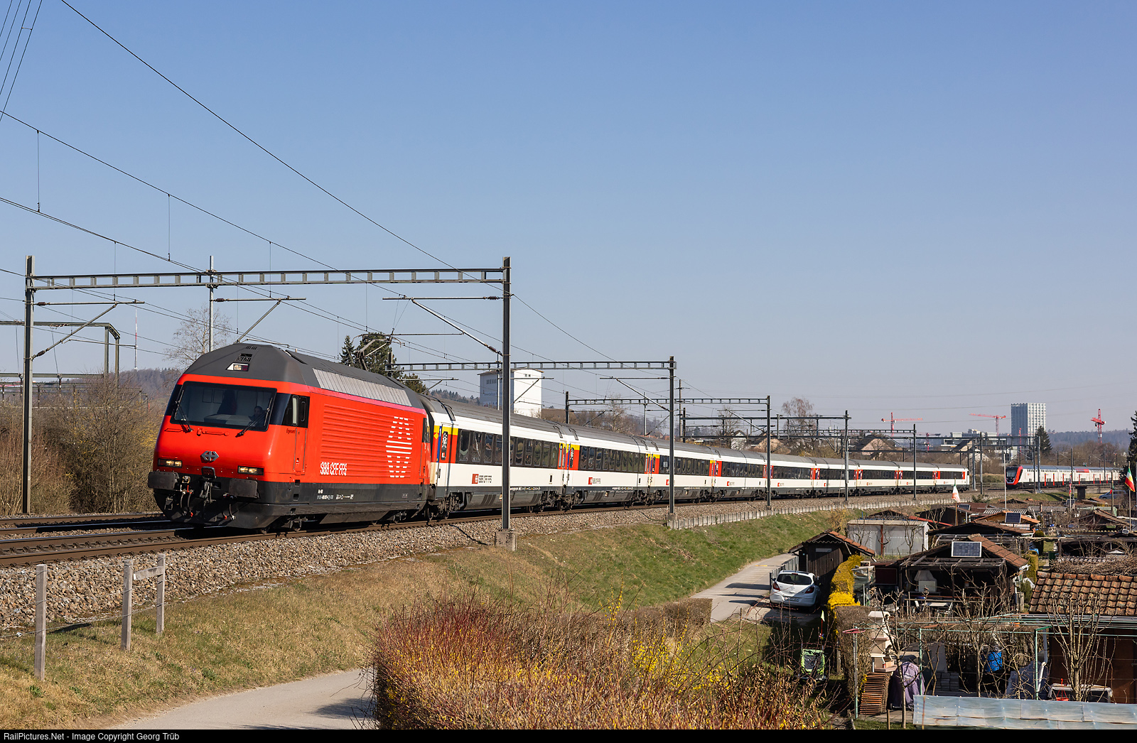 | Re 460 # 052 of the SBB is pulling the push-pull train IC 812 of the line IC 8 from Romanshorn to Zürich, between Winterthur and Winterthur Tössmühle. The train with standard cars type IV and Apm/Bpm cars was a substitute train running between Romanshorn and Zürich only, instead of running to Bern-Brig. In the background is the IR 3261 of the line IR 13 from Zürich via St.Gallen to Chur, a RABDe 502, running in the opposite direction. |