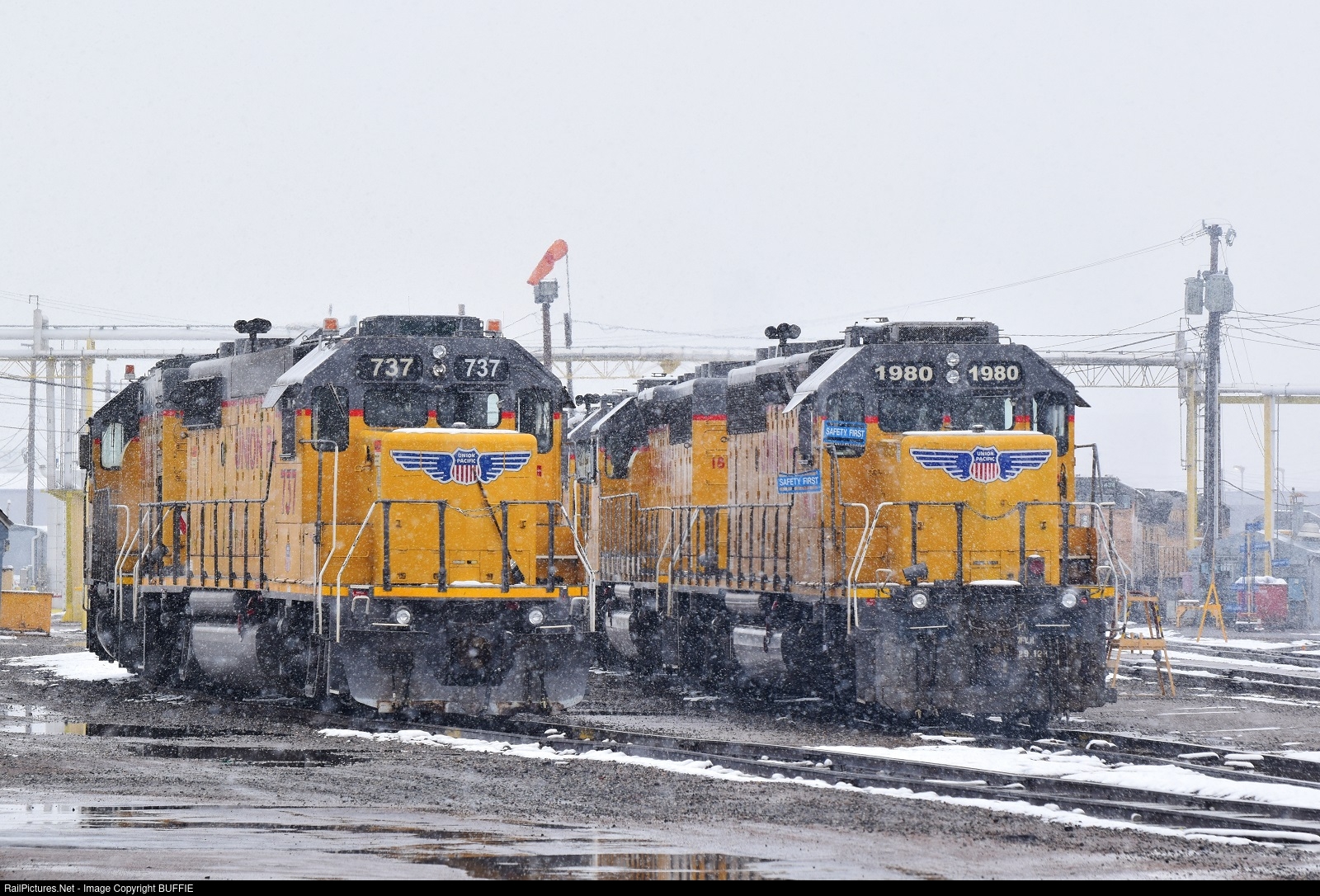 The snow is falling fast as UP 1980 (ex Southern Pacific GP38-2) and mates wait in the North Yard for assignments.