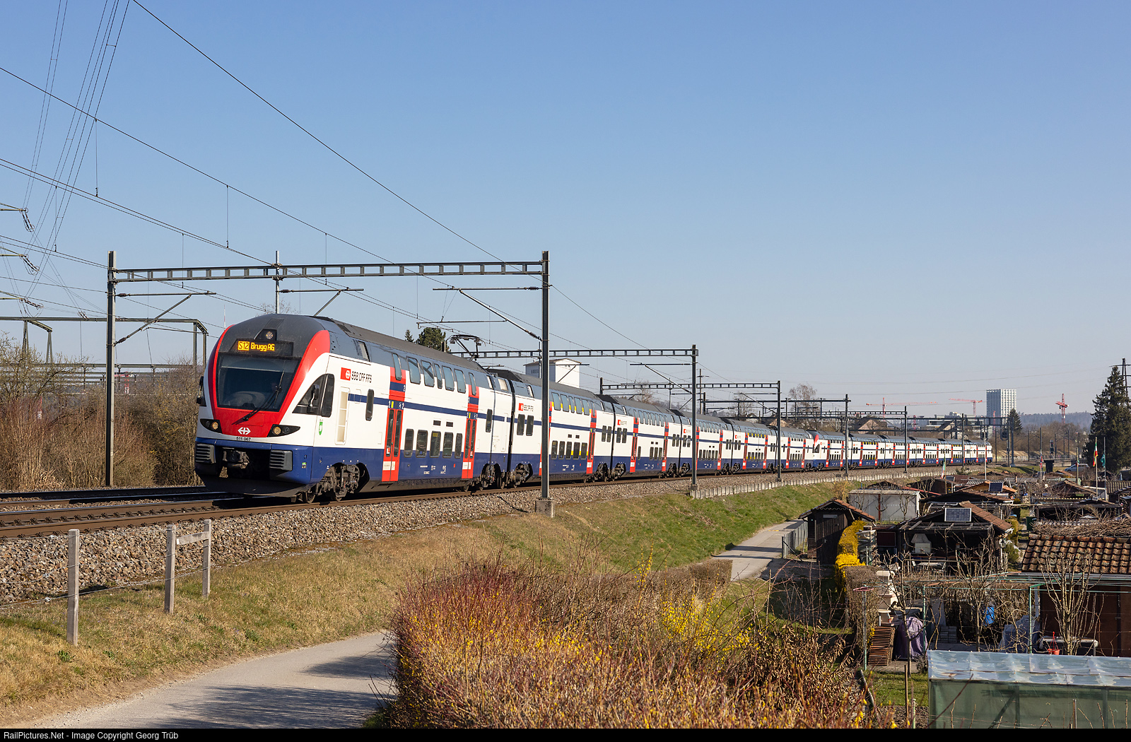 | Two coupled "KISS" commuter doubledeck trains with RABe 511 # 067 in front are running the S 12 service 19232 from Wil SG via Winterthur-Zürich-Dietikon to Brugg AG. From Wil SG to Winterthur, there was 1 train only, which is in the rear now. |