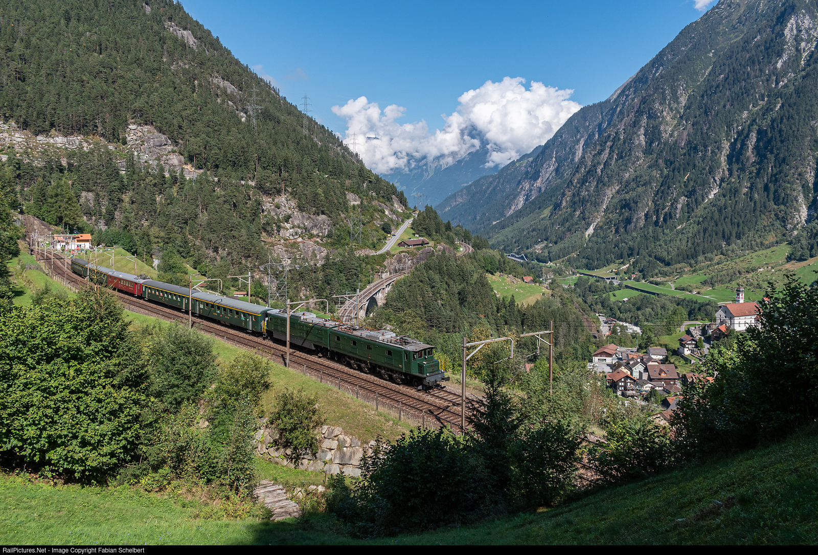 | At the Gotthard Bahntage, the giant from 1931 was once again allowed to run out on the Gotthard north ramp. The well-known church of Wassen can be seen in the background. |