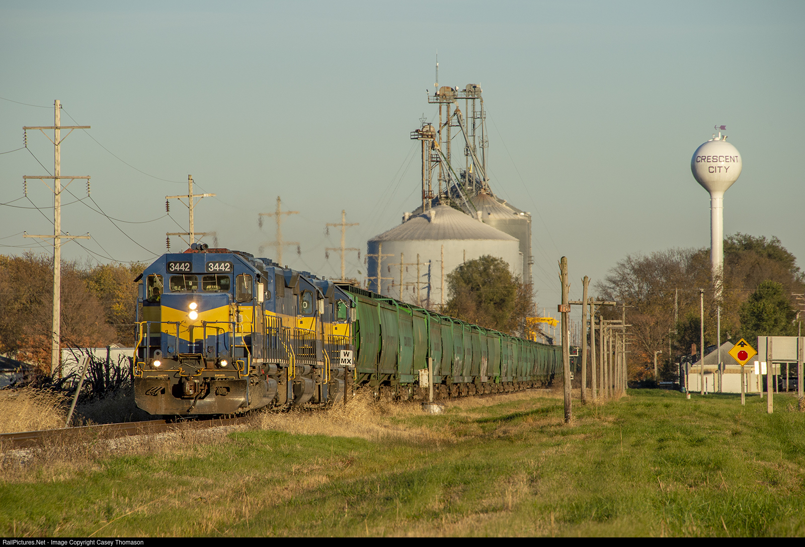 A westbound TP&W grain train passes through Crescent City during the last few minutes of bright sunlight.