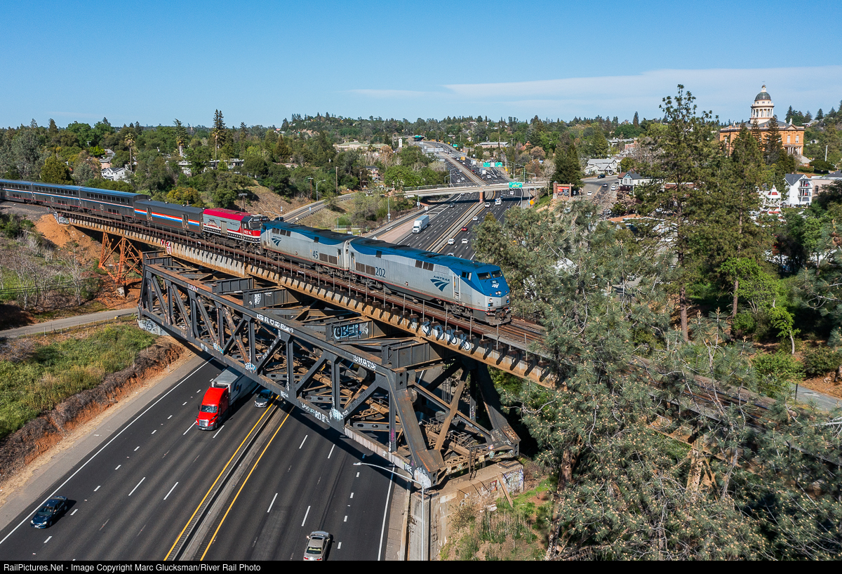Above It All In Auburn. Amtrak Train 5 (California Zephyr) had an extra and colorful addition to the head end, seen passing over Interstate 80 in Auburn, California on the afternoon of Friday, March 25, 2022. AMTK 90221 (F40NPCU, Salutes Out Veterans, formerly AMTK 221, F40PH) is 3rd out, behind P42DCs 202 and 45. NPCU means "Non Powered Cab Unit", as this former engine now only functions as a cab control car. It was with the consist from Chicago, Ilinois to Emeryville, California. The Placer County Museum/historic Auburn Courthouse is seen on the right of the photo, with its dome rising above the Auburn Historic District.