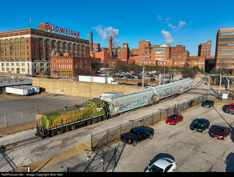 TPLX 1001 brings 3 cars down the middle of Dorcas Street and into the former Manufacturers Railway yard in St. Louis. The Budweiser plant always provides a nice backdrop.