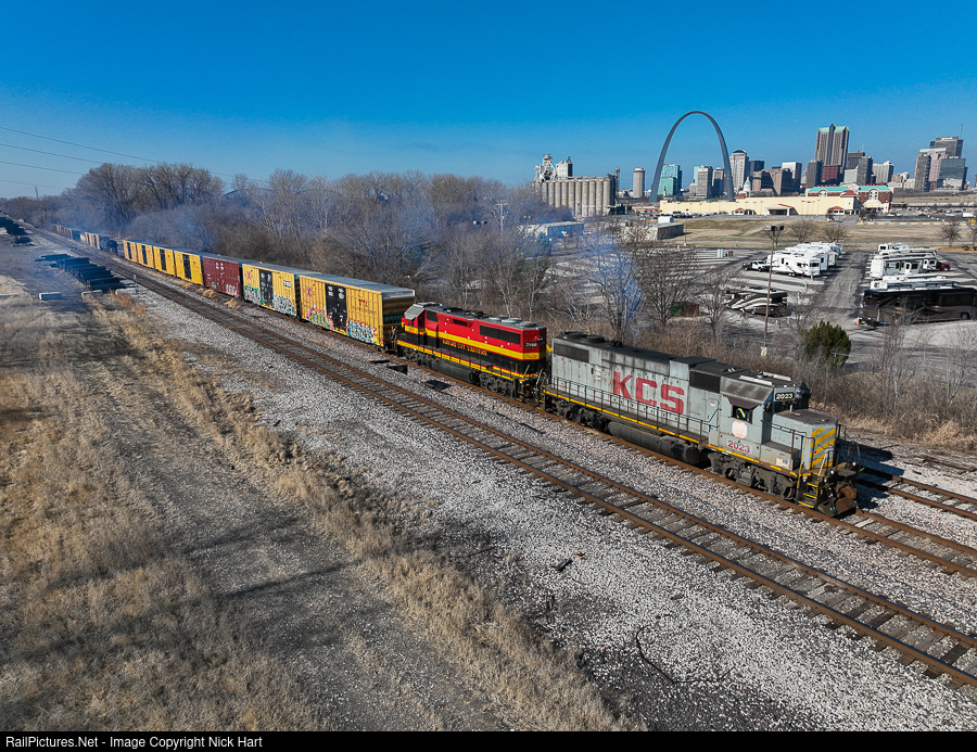 | The Gateway Arch provides the backdrop as KCS 2023 and 2958 lug a lengthy transfer from the Gateway Western Yard to TRRA's Madison Yard. It's been quite a while since I've shot a KCS original gray Geep leading, though they're more common here than they are back home in Chicagoland. |