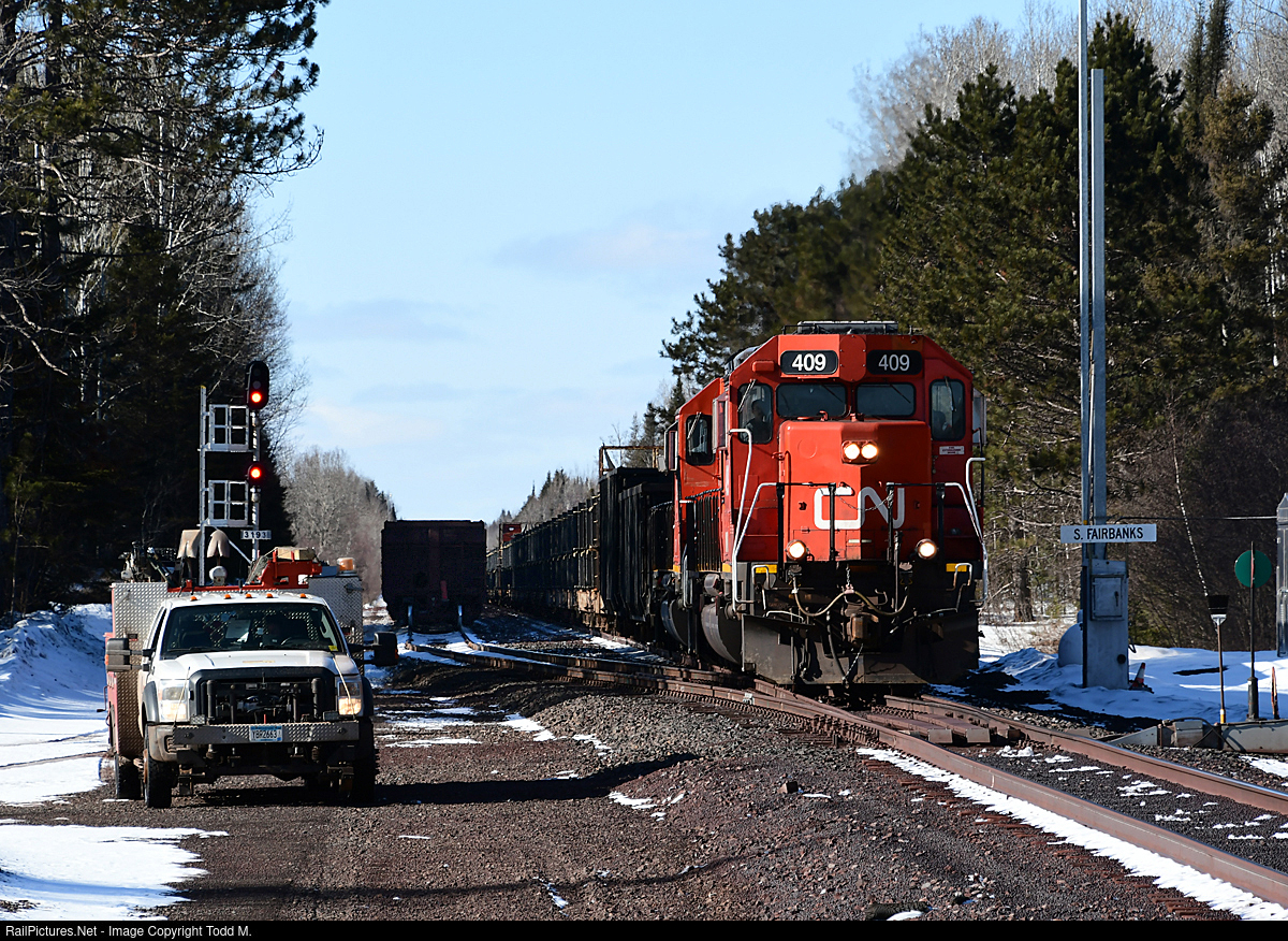 | DMIR 409 and GTW 5934 lead a rail train down the main on the Iron Range Sub at Fairbanks, MN while an empty ore train holds in the siding and M.o.W. workers hold in their warm trucks. It was nice to see DMIR 409 working here as these DMIR SD40T-3’s and other EMD’s don't really make it onto the Iron Range Sub anymore, with all of the ore trains having former CNW C40-8’s as power on them to move taconite between the mines and Two Harbors, MN |