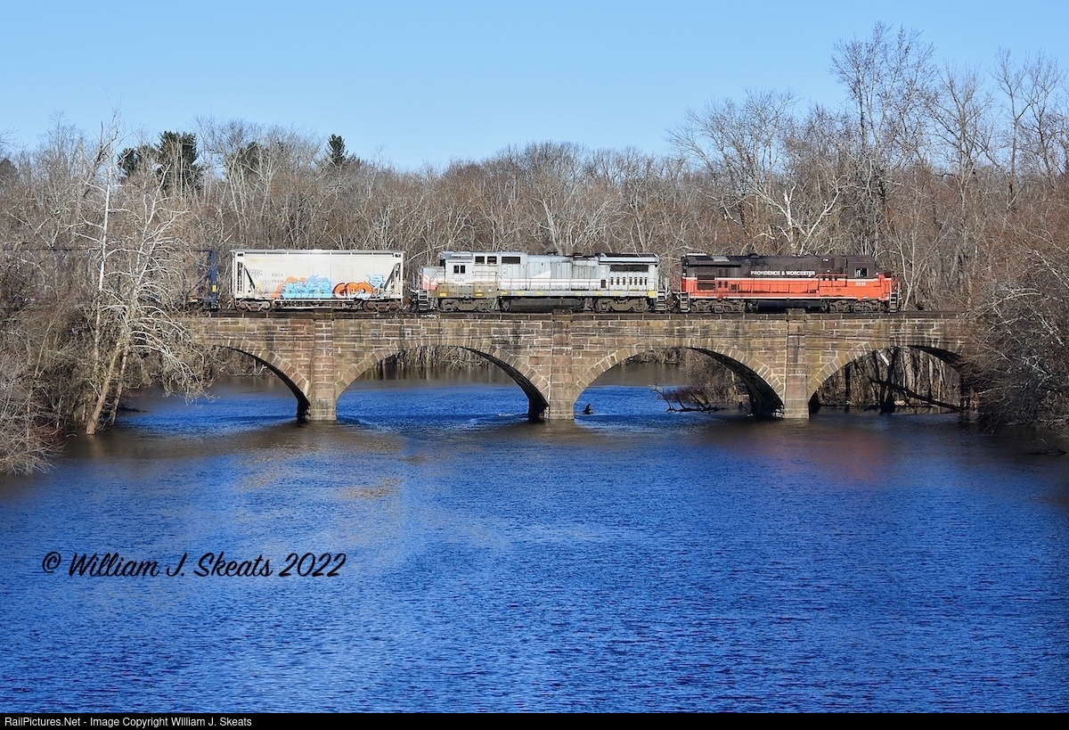 Passing over the Farmington River on the way to West Springfield to interchange with CSX. P&W 2215 and OHCR 8530 and 15 empties.