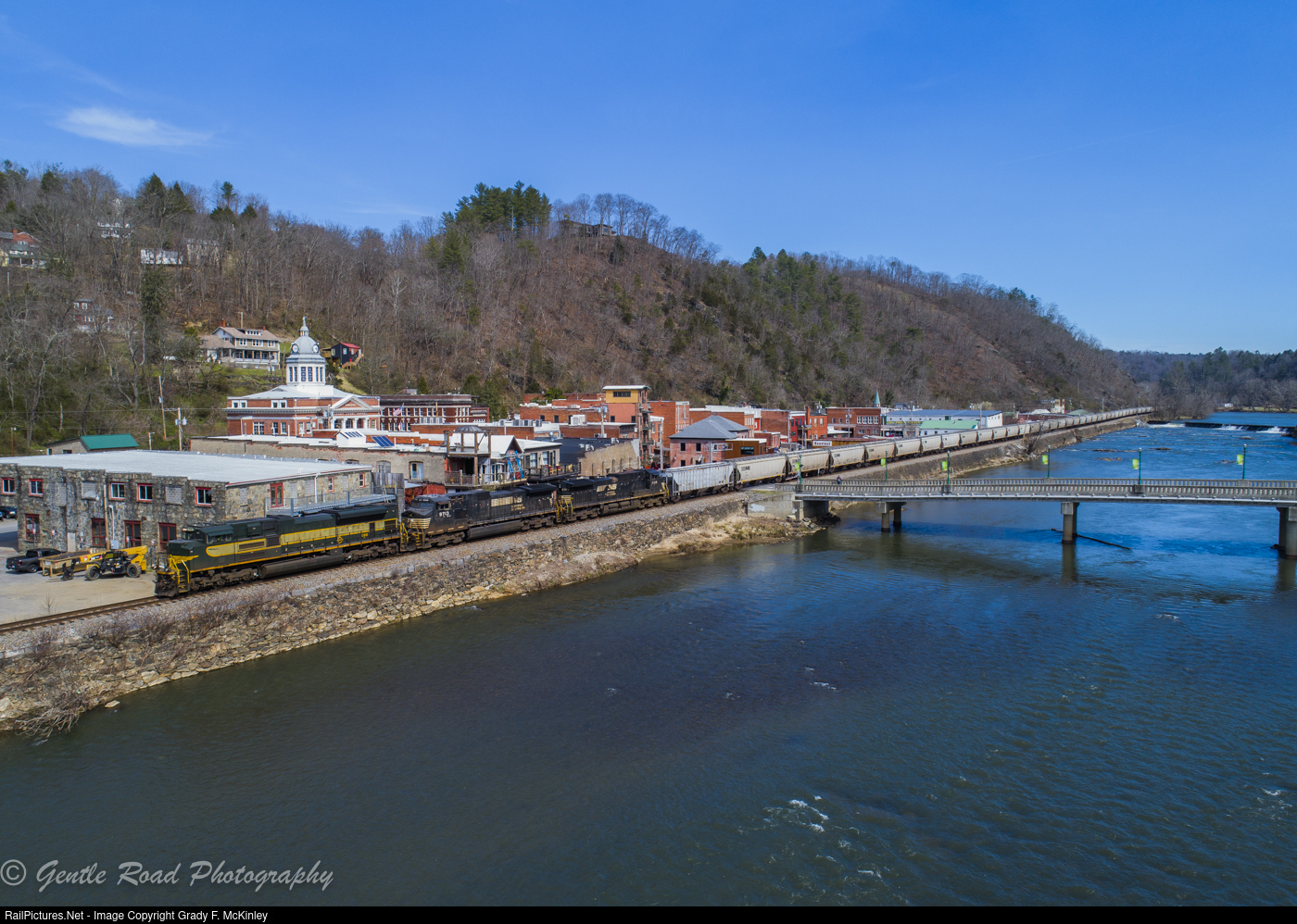 The Erie heritage leads a rare daylight westbound empty grain train in downtown Marshall along the banks of the French Broad River.