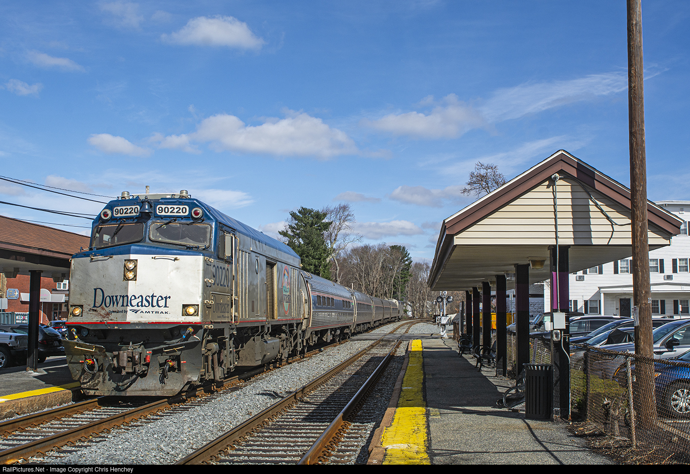 | A southbound Downeaster rolls through Melrose/Cedar Park station on its last legs to Boston. Green Line Extension construction should be wrapping up this summer for the service to Medford, which should have the Downeaster return to its normal routing via Medford. But for the next few weekends, Amtrak will continue to utilize the route of the old Flying Yankee via Melrose. |