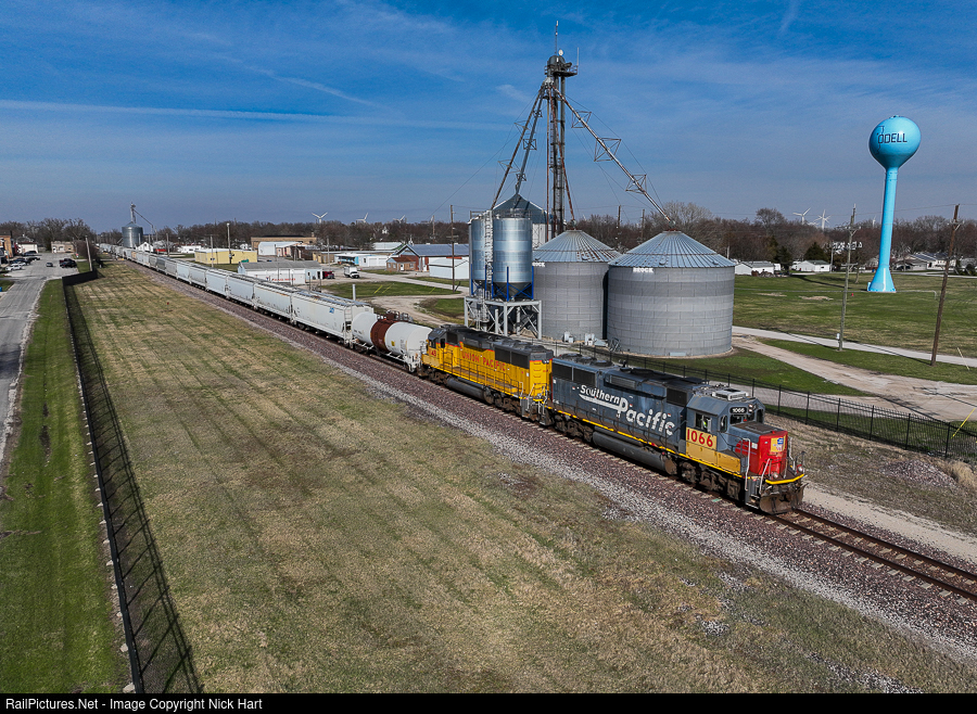 | UP LSF54 is highballing it southward through Odell, IL with a decent size train for Bloomington Yard. UP 1066, wearing sharp Southern Pacific paint, leads the way with help from a sister GP60. The rolling stock consists of 1 tank car from Dow Chemical (DuPont) in Wilmington and 23 covered hoppers from Hoffman Transportation in Coal City. My dad spent many summers in Odell during the 50's and 60's. I imagine the town was just as peaceful back then as it is now. |