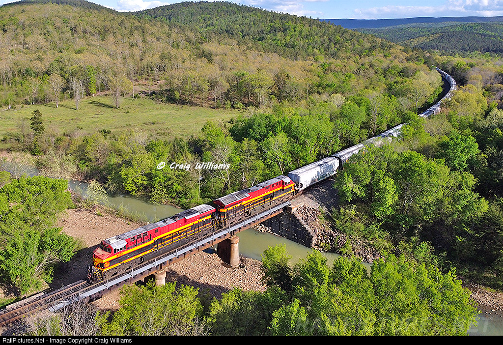 | 2 GE's are just beginning the hard shove on the back of this grain train as they dig into the 1% grade towards Rich Mountain. 4 GE's will fight gravity for the next 20 miles as they climb from 538 feet to the summit at Rich Mountain at 1621 feet. Here the train passes over Shawnee Creek about 10 miles south of Heavener. The Ouachita Mountains Range along the Oklahoma/Arkansas boarder was a tough area to build the railroad thru. |