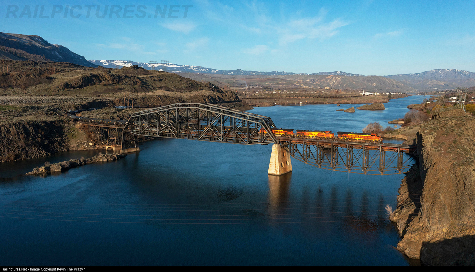 An eastbound BNSF coal drag with a cut of mixed traffic on the head end crosses the Columbia River at Rock Island.
