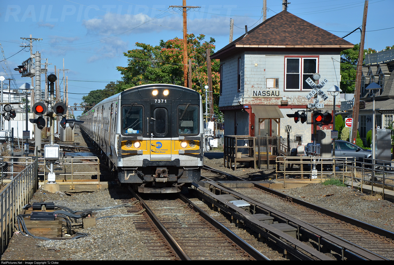Long Island Rail Road M7 EMUs come past 'NASSAU' tower at Mineola, NY. The tower was manned from its opening in 1923 until 2020. In 2021 it was demolished to make way for a third track as part of the LIRR Expansion Project.
