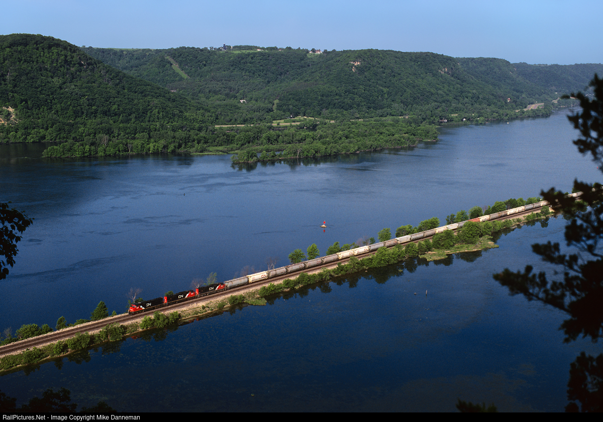 A climb up a tall bluff called Trempealeau Mountain just north of Trempealeau, Wisconsin, yields this vista of the Upper Mississippi River valley and part of Burlington Northern’s long causeway just east of Winona, Minnesota. On the morning of June 15, 1996, an eastbound Canadian National train, powered by a trio of EMD SD70I locomotives, slices its way over the impressive route on the Wisconsin side of the river.