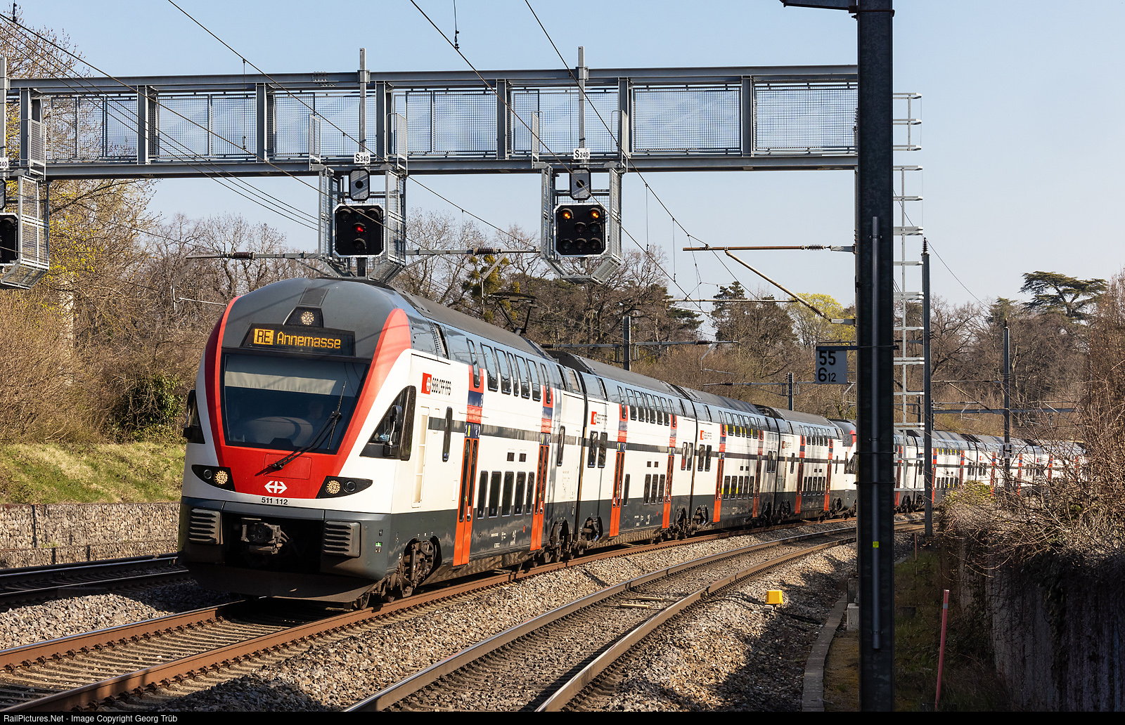 | StadlerRail commuter doubledeck trains "KISS" RABe 511 # 112 (4 cars) and RABe 511 # 036 (6 cars) of the SBB are running the Regio Express 18410 from Vevey via Lausanne-Geneva to Annemasse, on the mainline near the Les Tuileries stop. This train has 872 seats in first and second class. |