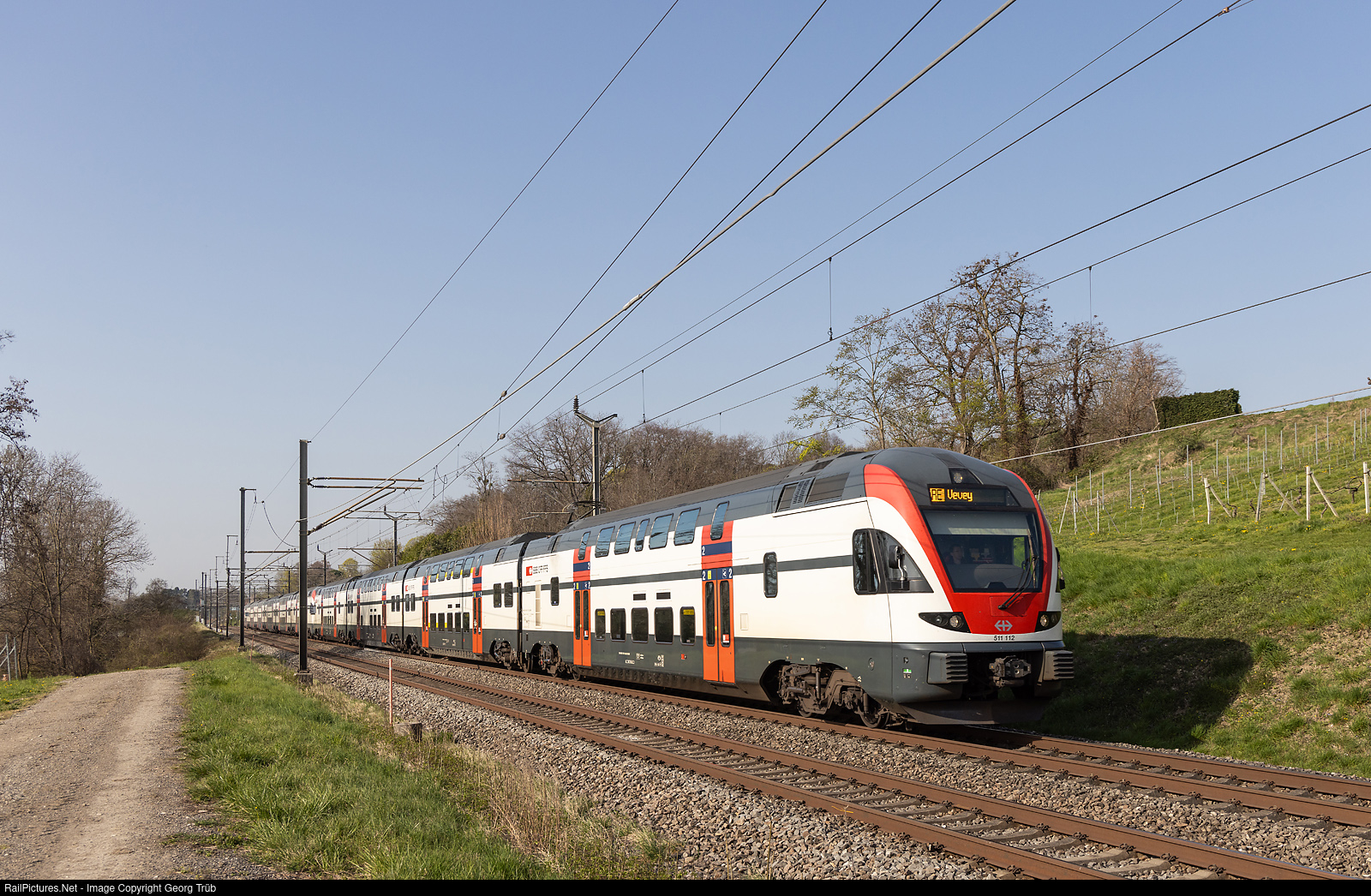 | StadlerRail built "KISS" commuter doubledeck trains RABe 511 # 112 (4 cars) and a RABe 511 # 0.. (6 cars) of the SBB in multiple control are running the Regio Express 18417 from Annemasse via Geneva-Nyon-Lausanne to Vevey, between the former stops of Céligny and Crans VD, on the mainline along Lake Geneva. The RABe 511 # 112 has a silver instead of a white SBB signet on the front. |