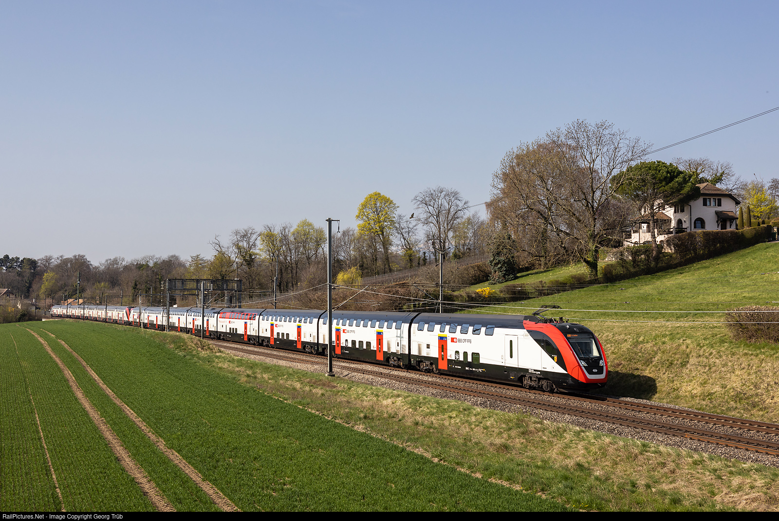 | Intercity 717 of the line IC 1 from Geneva Airport via Lausanne-Fribourg-Bern-Zürich-Winterthur to St.Gallen, running at 140 km/h (87 mph) on the mainline along Lake Geneva, between the former stops of Céligny and Crans VD. Bombardier (now Alstom) built "FVD" (Fernverkehrsdoppelstockzug) RABDe 502 # 010 "Ville de Genève" (IC200) and RABe 502 # 213 (IR200) in multiple control. |