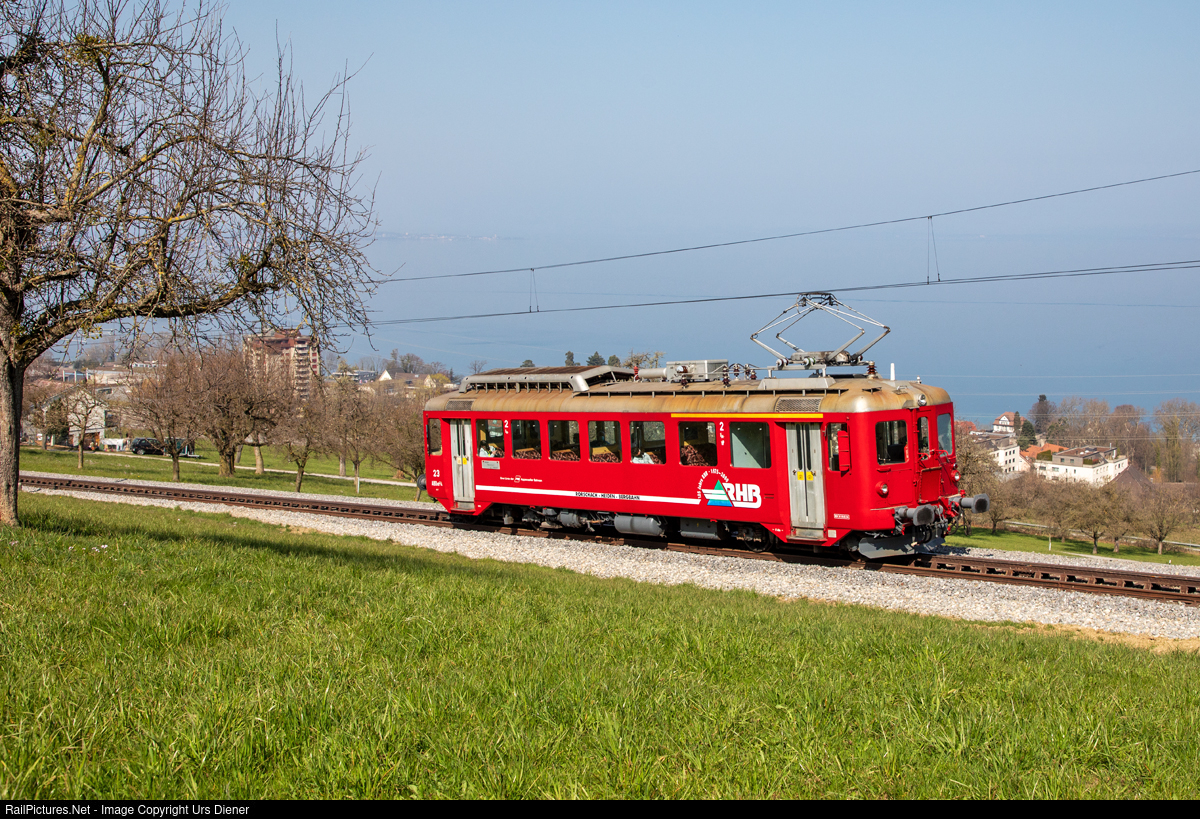 | Due to maintenance work on the regular used cogwheel railcar BDeh 3/6 25 of the Rorschach-Heiden-Bergbahn (belongs to the Appenzeller Bahnen), the 1953 built cogwheel railcar ABDeh 2/4 23 was on duty between Rorschach Hafen and Heiden. The standard gauge line from Rorschach to Heiden is 7 km (4,3 miles) long and is equipped with the Riggenbach rack system. The maximum incline is 93.6‰. |