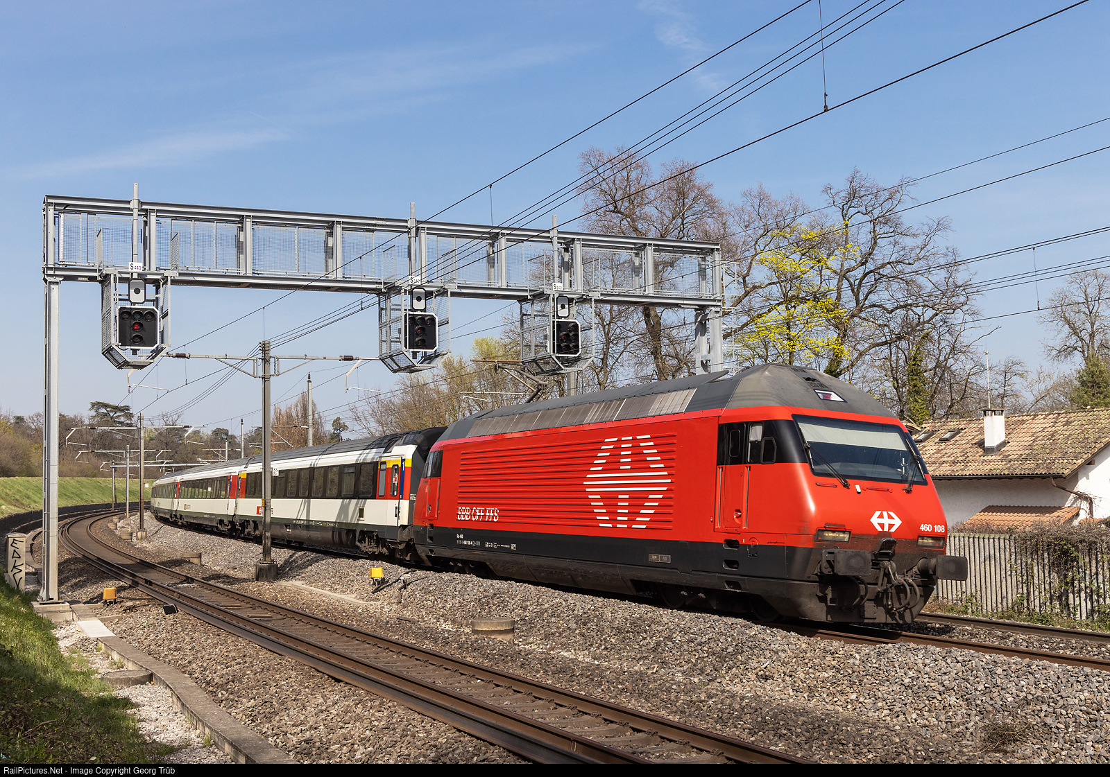 | Re 460 # 108 of the SBB is pulling the Interregio 3122 from Brig to Geneva Airport on the mainline near the Les Tuileries stop, shortly before Geneva. |