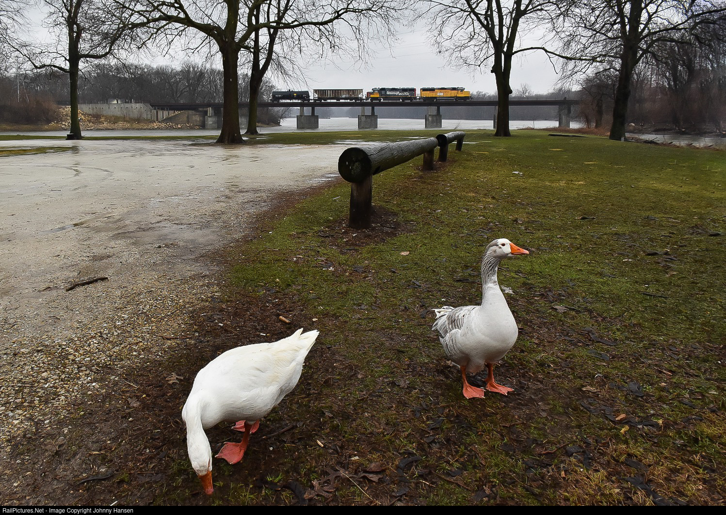 The pouring rain doesn’t stop the local snow geese from looking for food as the Union Pacific North Local (UP LSF54) thunders north over the Kankakee River with two GP60’s and cars for DOW Chemical and Prairie Creek.