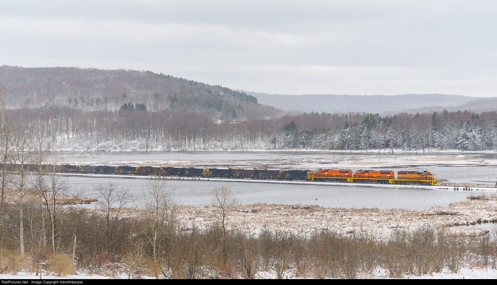| Some late season snow blankets the landscape in Bird Run, New York as an SD40-3 and two SD50's lead X-COAL over the causeway through the swamp. The train is heading north towards Buffalo for unloading. |