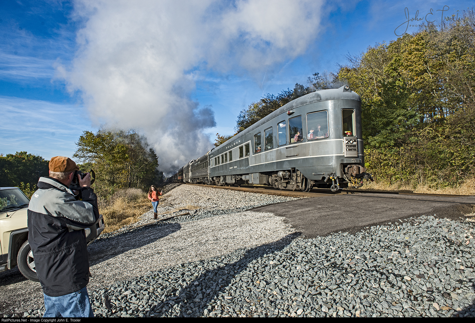 | RIP Jim Wrinn. I heard about Jim's passing this evening. I had the pleasure to take Jim on a tour of the NS Wabash line between Ft. Wayne and Lafayette, IN on a cool fall day October 2013. We were chasing the westbound NKP 765 excursion. Jim is shown here in my photo making a capture of the Hickory Creek bringing up the rear of the train. Jim was a great editor and a greater gentleman. |