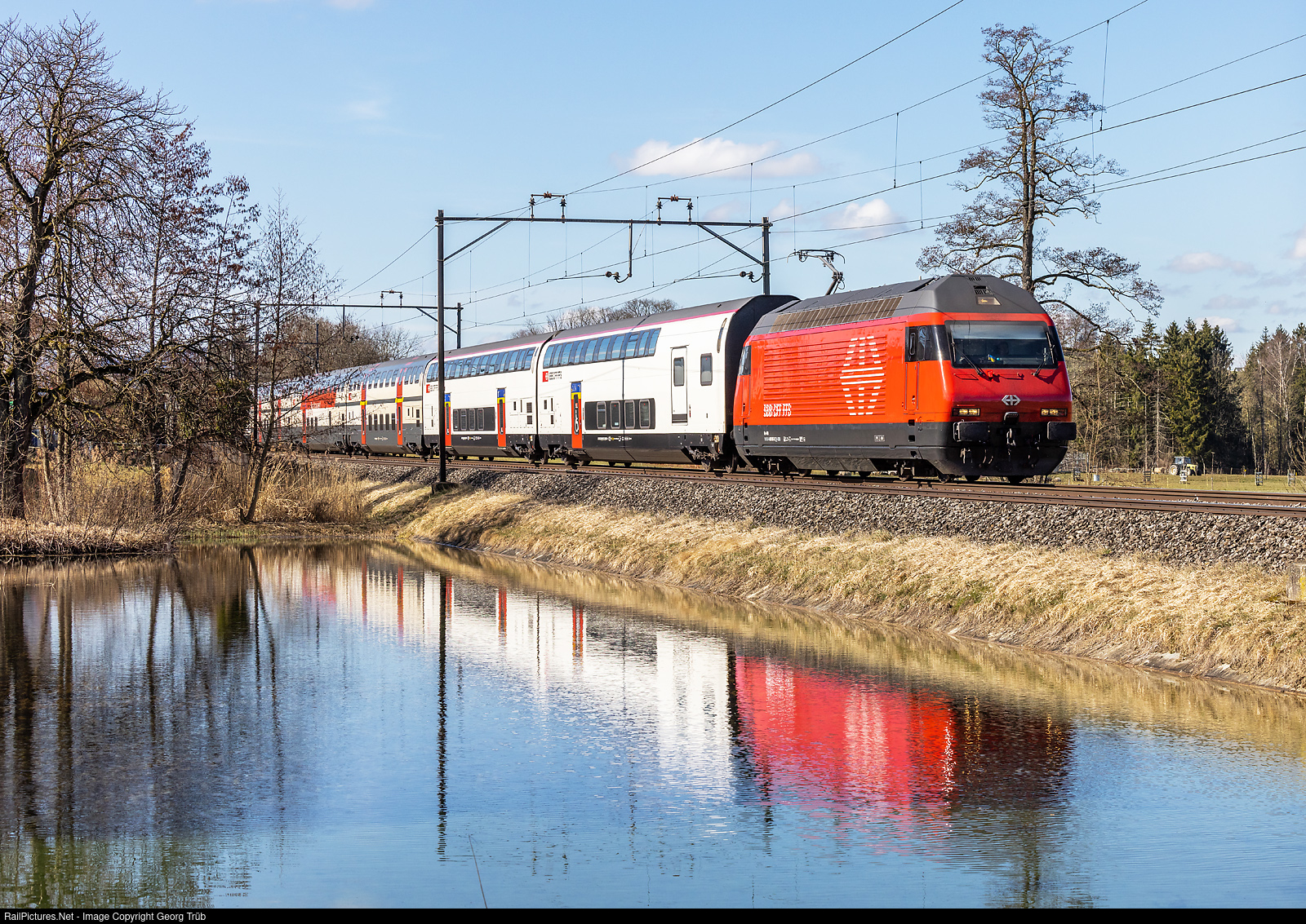 | Re 460 # 067 is pulling the IC 811 of the line IC8 from Brig via Bern-Zürich to Romanshorn along the pond at Riedt near Erlen. |