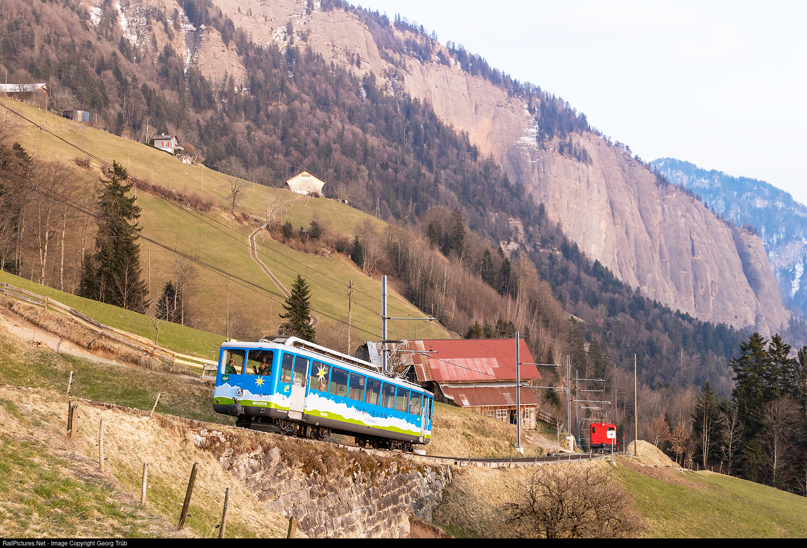 Cogwheel railcar Bhe 2/4 # 4 of the Rigi Bahnen in the Migros Zentralschweiz paint scheme is running up below Freibergen, with locomotive He 2/2 # 18 following on sight distance. This was during the farewell run for the railcar Bhe 2/4 # 3, which operated for the very last time..