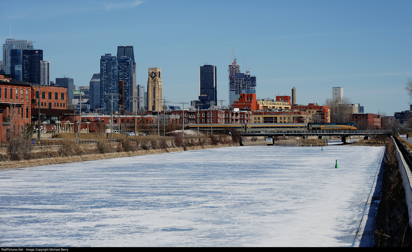 After a cold spell the Lachine Canal is still frozen as VIA 24 with VIA 902 and a HEP consist crosses it.
