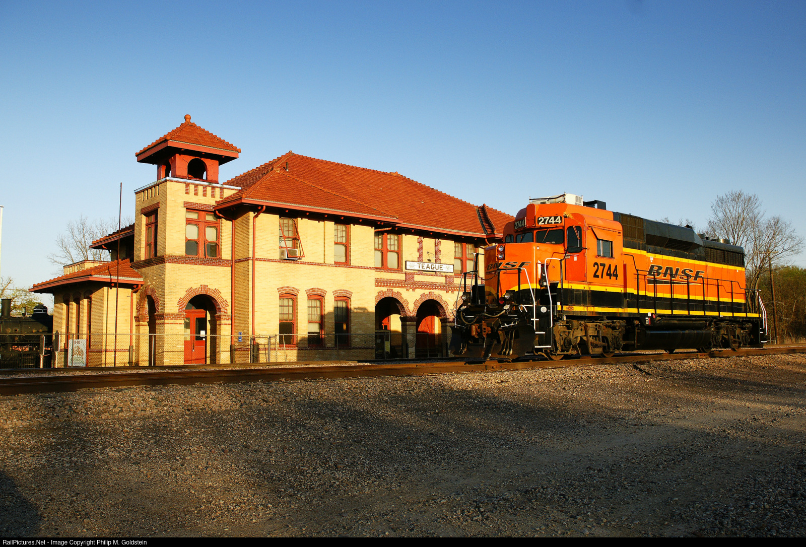 Former Chicago, Burlington & Quincy EMD GP30 #959 basks in the setting afternoon sun in front of the Teague Depot (National Register of Historic Places and Texas State Antiquities Landmark). The depot was built in 1907 by the Trinity & Brazos Valley Railway and then served the Burlington-Rock Island Railroad from 1930 until 1968 when the railroads offices were moved. The B-RI Museum opened the same year, and the structure and property sold to the City of Teague in 1979. The well run Museum is still present. EMD c/n 27170 built: July 1962 order No: 7621 current: BNSF 2744 ex-BN 2574 [Rebuilt EMD to GP39-2] exx-BN 2236 [EMD GP30] built as Chicago, Burlington & Quincy 959 [EMD GP30]