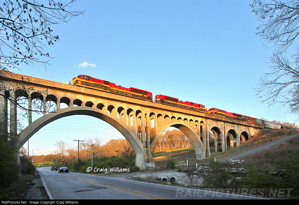 | A northbound grain empty rumbles across the 1928 cement Gregory Boulevard Viaduct Bridge around MP 15 on the southside of KC. The bridge spans 500 feet long on the KCS Pittsburg Sub. It is one of many bridges that the KCS built in 1928 when they relocated the mainline out of the Blue River Gore and to ease the grade and problems the old mainline faced. Cool old bridge, kind of sucks it blocks alot of the trucks on the engines. |