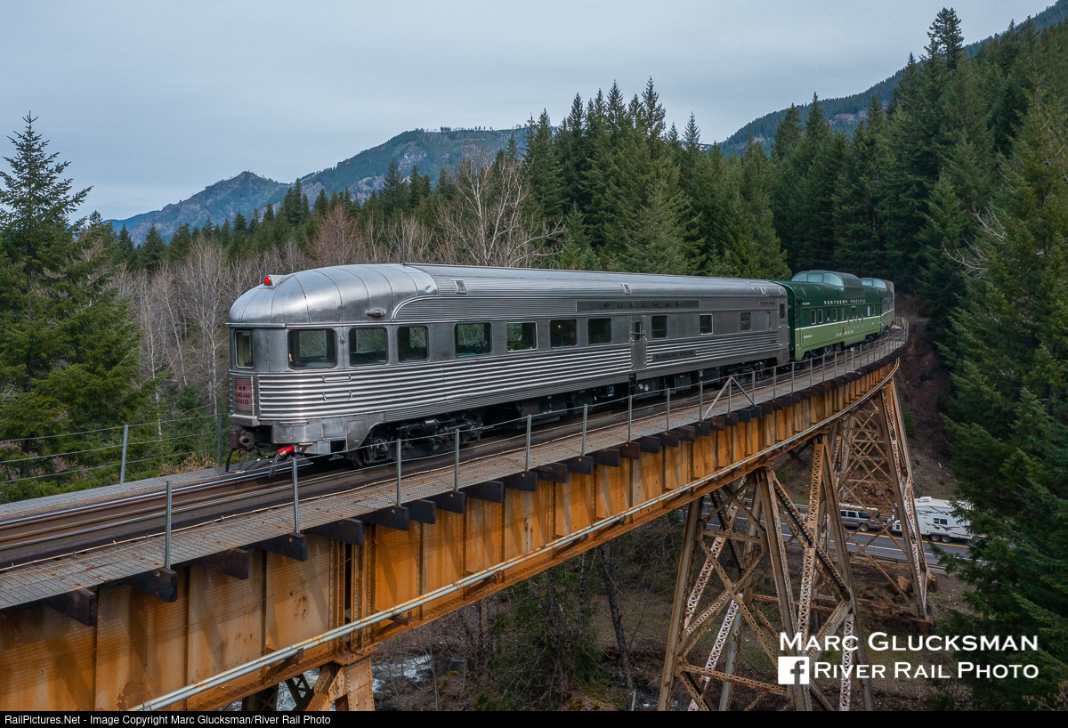 Bridge Through The Trees. After traveling a circuitous route through the mountains surrounding Diamond Peak in Oakridge, Oregon, Webb Rail's former Northern Pacific Railway Budd built Pullman dome/sleeper 313 (WEBX 801044), former Northern Pacific Railway Budd built dome/coach 549 (WEBX 801045), and former New York Central Railroad Budd built Pullman obs/diner/sleeper "Babbling Brook" (WEBX 800007) are seen crossing Willamette Highway on Sunday, March 27, 2022. The cars were added to the rear of Amtrak Train 14 (Coast Starlight) in Oakland, California the previous evening, and would travel to Seattle, Washington. The name “Coast Starlight” is a combination of the names of the predecessor Southern Pacific (SP) trains, the Coast Daylight and the Starlight, accentuating the scenic nature of the overnight trip.