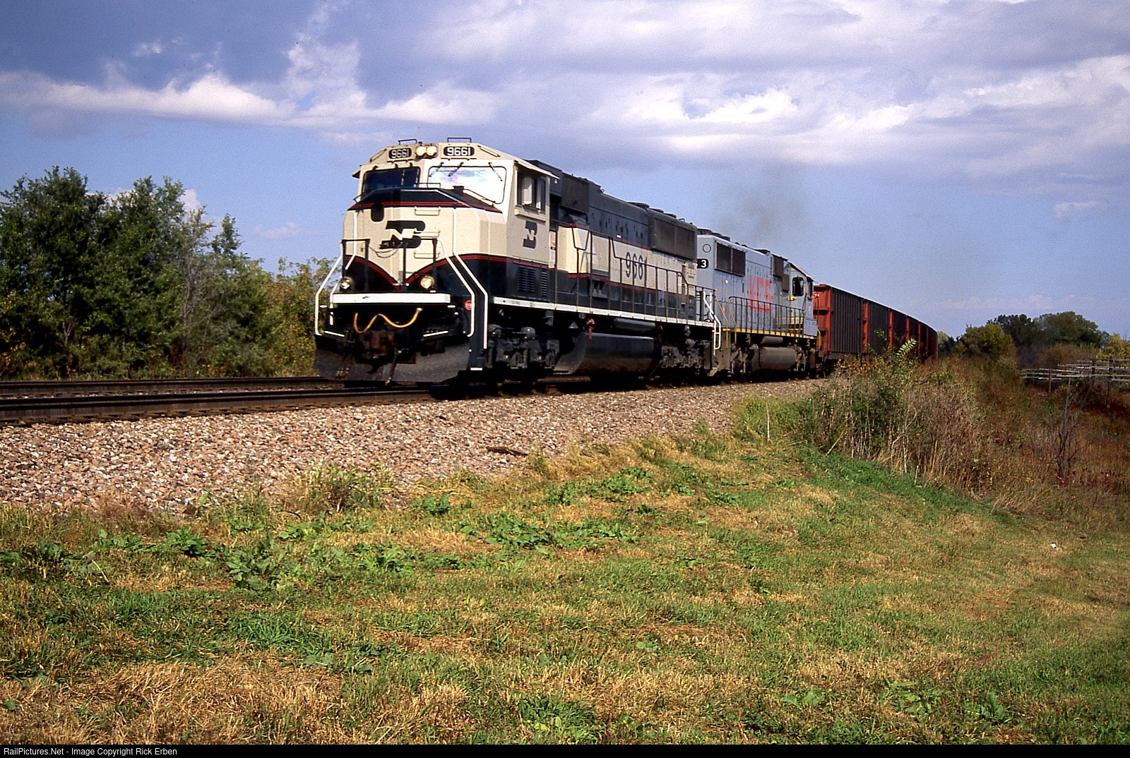 One reason I like the BN Grinstein green color is its similarity to Pennsy's Brunswick green. Although the BN color is more overtly green, in certain light it can appear black - as did PRR's "green" most all of the time. BN 9661 with a KCS mate dashes out of Greenwood, NE with empty coal cars bound for Lincoln and beyond.