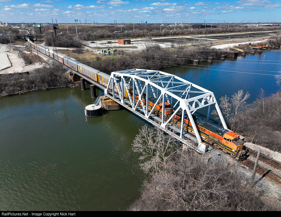 | A pair of Heritage 1 Dash 9's make for a nice catch as they lead a vehicle train over the Chicago Sanitary & Ship Canal in McCook. The train is in the process of exiting the BNSF Chillicothe Sub and entering the IHB. |