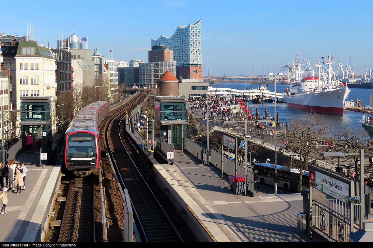 Imposing scenery at the station Landungsbrücken: U-Bahn-Line 3 arrives at the station, the high building in the background is the Elbphilharmonie (a very modern music hall, opened 2016) and the white-red ship on the right side is the Cap San Diego, an old freight ship built 1961 just before the container was invented.