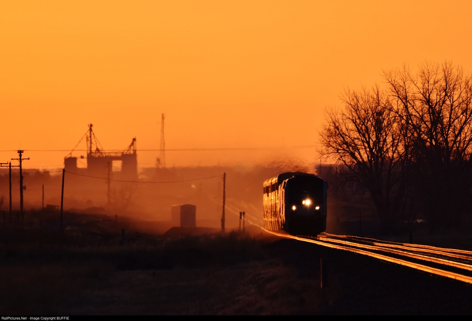 The California Zephyr runs through Bijou, Colorado just as a golden sunrise develops in the sky.