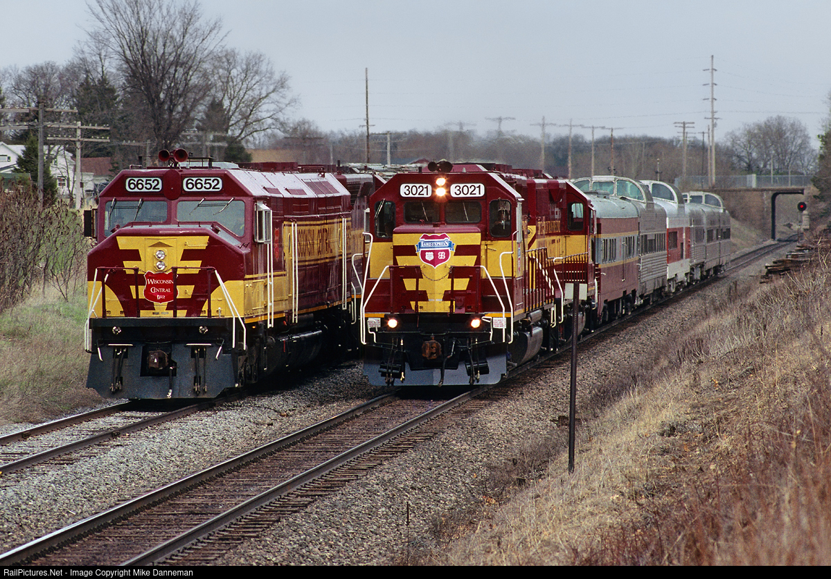 While a westbound Wisconsin Central freight, led by WC EMD FP45 No. 6652, sits on the connection track to the old Green Bay & Western (acquired by WC in August 1993) at Amherst Junction, an extra passenger train rolls by on the WC main line on May 2, 1996. This special, called the Laird Express, operated from Waukesha to Marshfield to raise money for the Marshfield Clinic. Former U. S. Secretary of Defense (and strong supporter of medical research and heath) Melvin R. Laird and Olympic gold medal speed skater Dan Jansen were among the guests on the train. WC EMD GP40 Nos. 3021 and 3017 carried special “The Campaign Train for Science” lettering as well as unique “‘Laird Express” nose emblems specially-applied for the occasion.