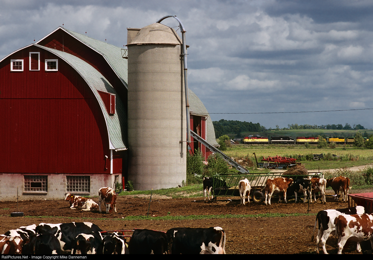 A northbound Fox River Valley Railroad freight passes a Wisconsin dairy farm south of Eden on August 30, 1992. The train is powered by the road’s pair of EMD SD24s bracketing an EMD SD35, along with a pair of Chicago & North Western EMD GP50s. Today, nothing but bikes and hikers pass by on the old, abandoned grade now called the Eisenbahn State Trail.