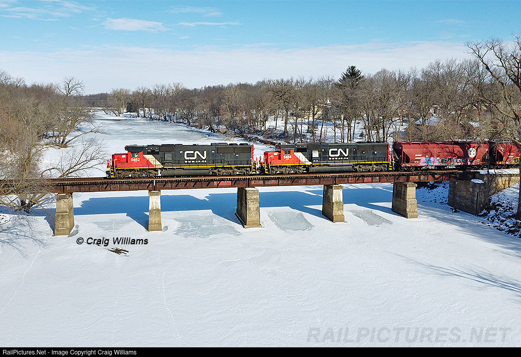 | The Cedar River has taken on a new look late January. The CN changed the job to go to 1 crew with no company vehicle. The job now is working without a defined schedule and also times when all the work is not getting done thru the week. Over the weekend heavy traffic filled Waterloo Yard with Cedar River cars. Here the job blast over the frozen Cedar River at Janesville with a big train. The crew would tied down the train at Waverly and take the power to Osage before their hours at 2pm. There will be another try again tomorrow to continue north. |