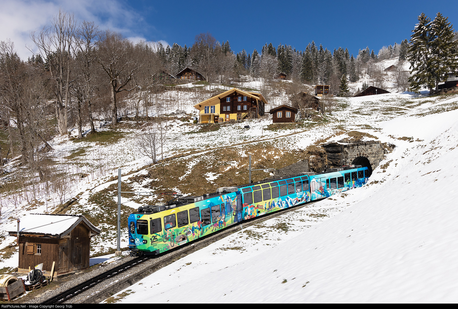 Coghweel panorama train Bhe 4/8 # 143 of the Wengernalpbahn (WAB), in the publicity paint scheme for 125 years WAB (1893 to 2018), is running on the 18.0 % grade up from Lauterbrunnen to Wengen and the Kleine Scheidegg, below the 248 meter long Kehrtunnel (loop tunnel) near Wengwald stop.