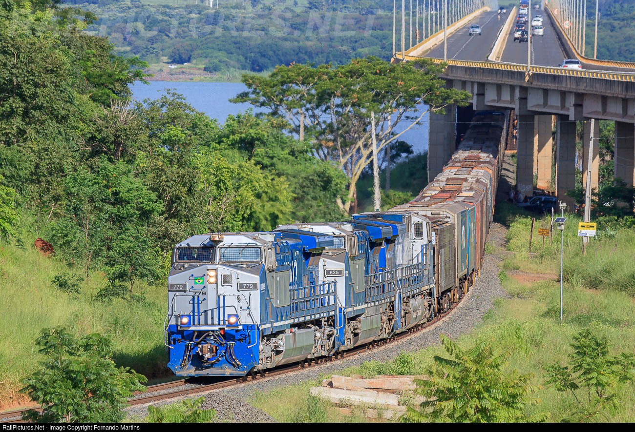 | Empty train led by GE AC44i #779 passing over the road-rail bridge on the border of the Brazilian states of São Paulo and Mato Grosso do Sul. This bridge is 3,200 meters (about 10ft 5in) long over the Paraná River. |