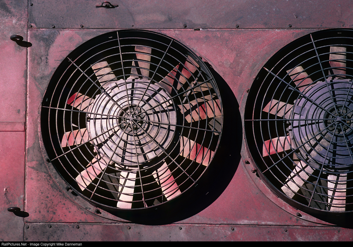 Looking straight down on the dynamic brake fans of Wisconsin Central EMD SD45 No. 6593 at the locomotive facility at Shops Yard at North Fond du Lac, Wisconsin, on April 5, 1996.