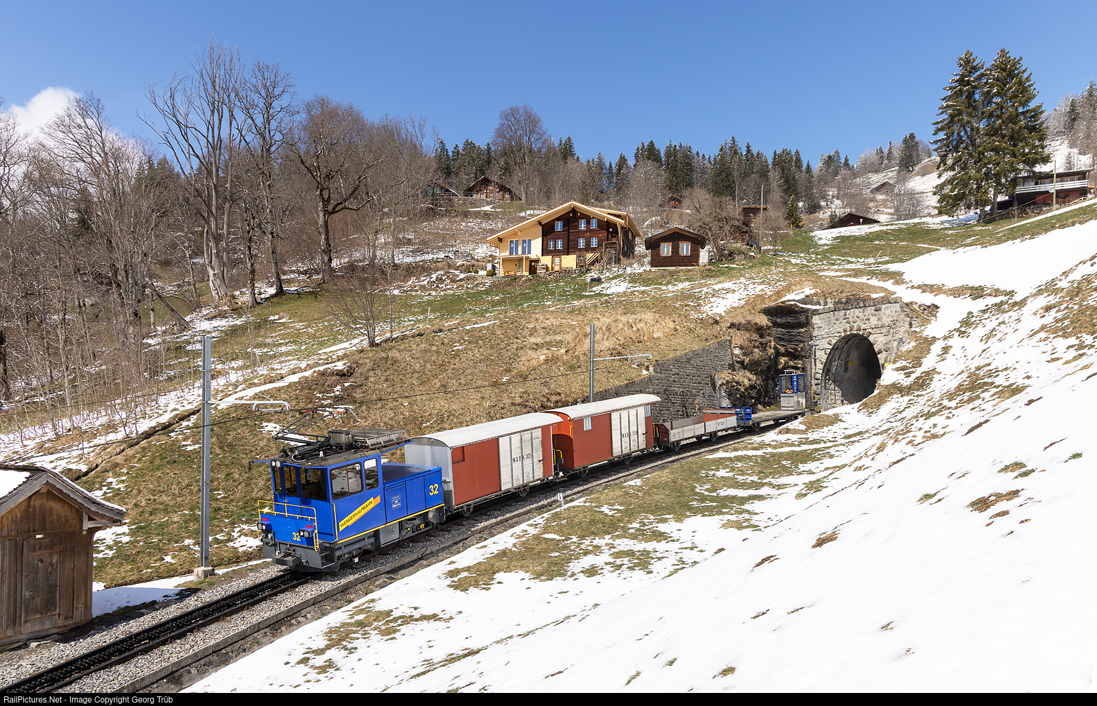 Cogwheel locomotive He 2/2 # 32 of the Wengernalpbahn, built in 1995 by SLM, Stadler and ABB, is shoving a freight train from Lauterbrunnen to Wengen on the 18.0 % grade below the Kehrtunnel. The cars are covered freight Gk # 305 (built 1960, designated K # 305), Gk # 309 (built 1964, designated K # 309, flat car Kk # 423 (built 1926) and flat car with driver cab Fk # 831 (rebuilt 2012 from Gk 304 of 1926). The engineer is sitting in the cab of the first freight car and is radio controlling the locomotive in the rear.