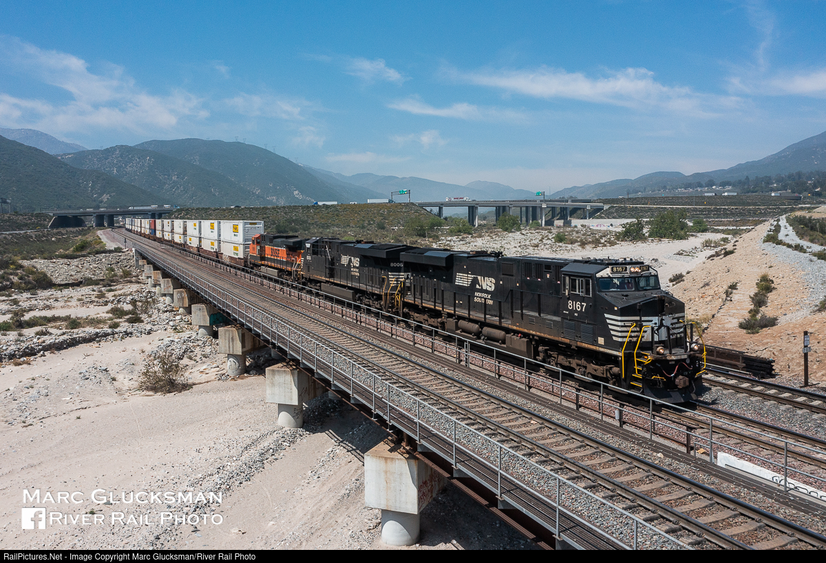 Been To The Desert On A Horse With A Name. Norfolk Southern Corp 8167 and 8006 (ES44AC) had just gone through Cajon Pass as they lead an intermodal train approaching the Glen Helen Parkway overpass in San Bernadino, California on Monday, April 4, 2022. This area is dominated by Union Pacific Armour Yellow and BNSF Orange, so these visitors from the East Coast really stand out in this environment.